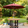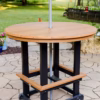 This spacious 48-inch round bar table is designed for outdoor enjoyment, featuring footrests for relaxed seating and a central umbrella hole for added shade options.